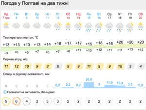Температура на рівні +13 в день буде триматися з 7 по 13 травня, а потім почне теплішати. Водночас з тим прийдуть рясні дощі та грози, повідомляють синоптики. Особливо великі зливи прогнозують у Полтаві в понеділок 15 травня й очікують майже третину місячної норми опадів.