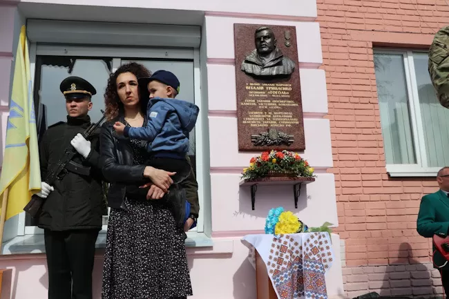 Відкривали меморіальну дошку дружина загиблого бійця та його син.